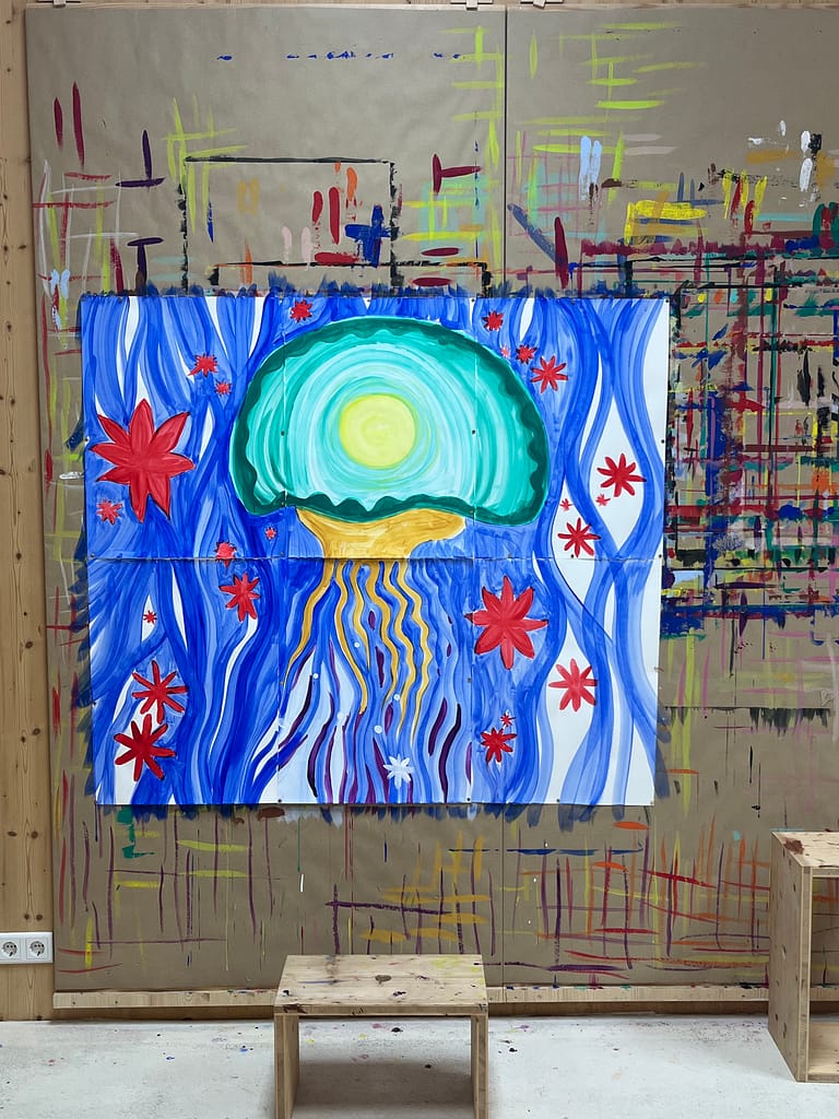 Als je op die manier schildert sta je in een ongebroken contact met de kern van je potentieel. En als dit vaag in je oren klinkt – kunnen we je beloven dat de realiteit in de Schilderruimte zeker niet vaag is, maar zeer concreet. De sfeer is vrolijk en geconcentreerd, licht en serieus.
